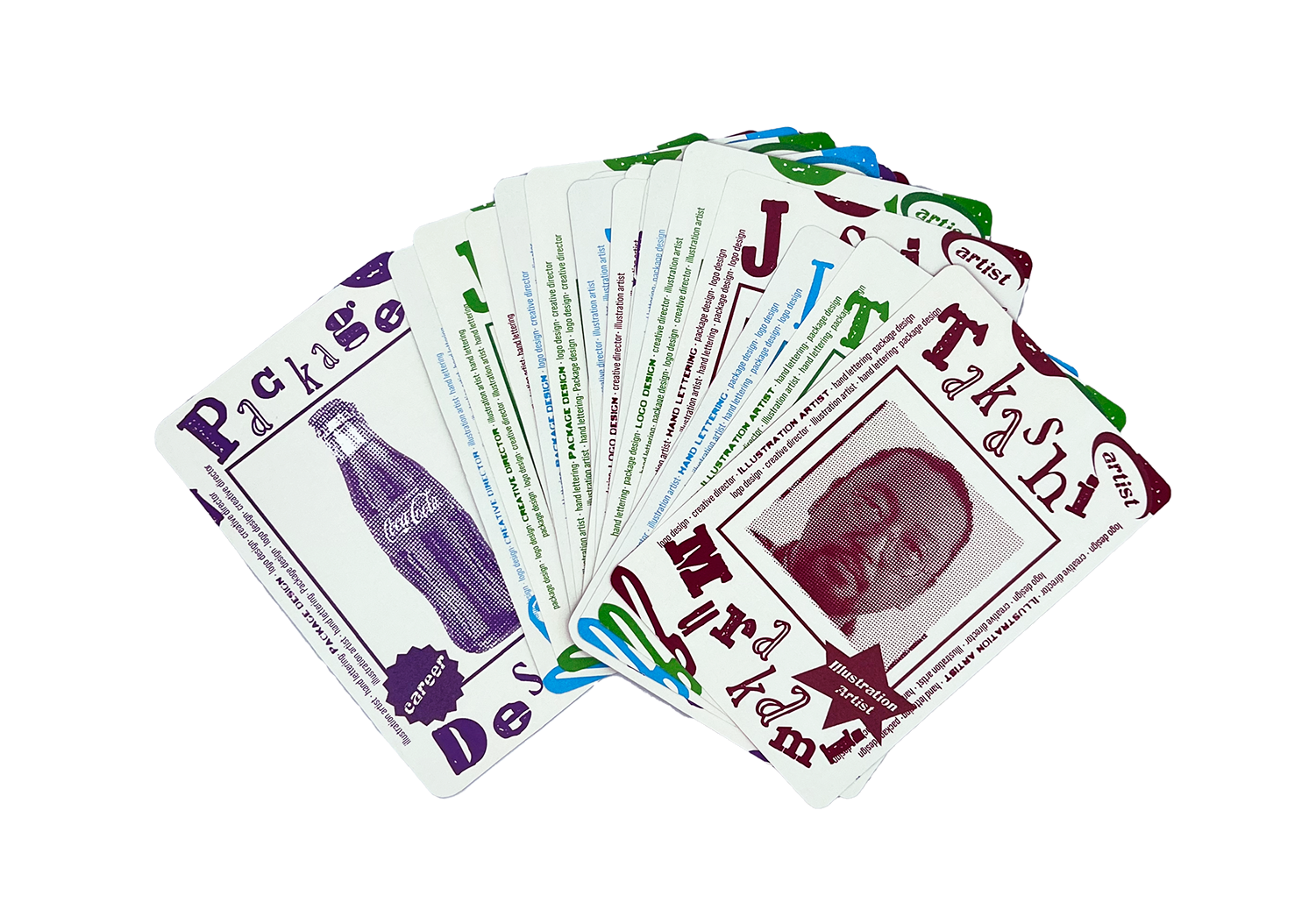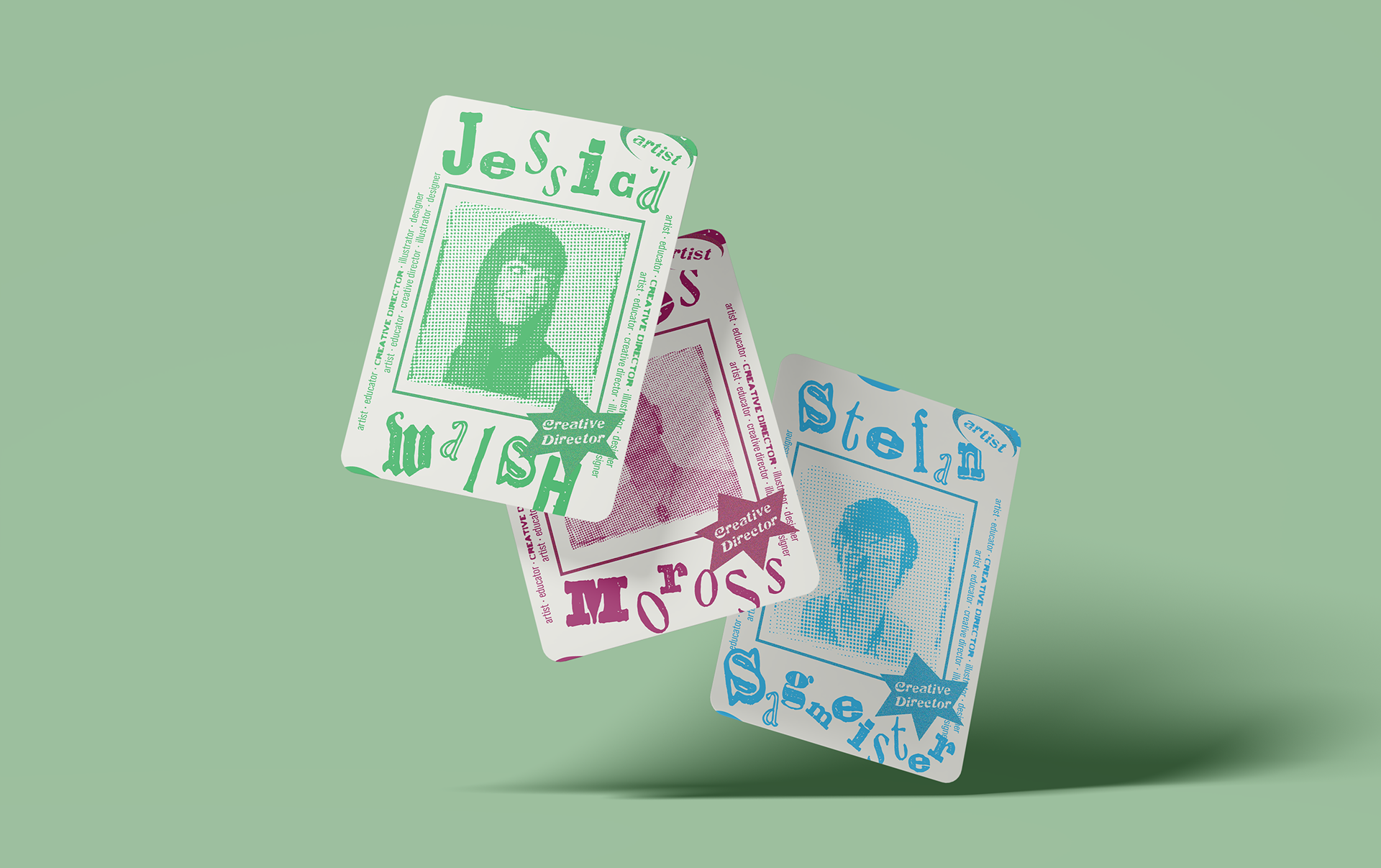 These David Carson and grunge-inspired cards showcase information about 20 different artists and their careers in the graphic arts world. The card format creates an immersive learning experience that engages the viewer, making learning feel effortless. Designed to invite exploration, the focus remains on the captivating design and content. The vibrant colors and bold aesthetics aim to inspire artists, fostering a sense of optimism about all they can achieve.
